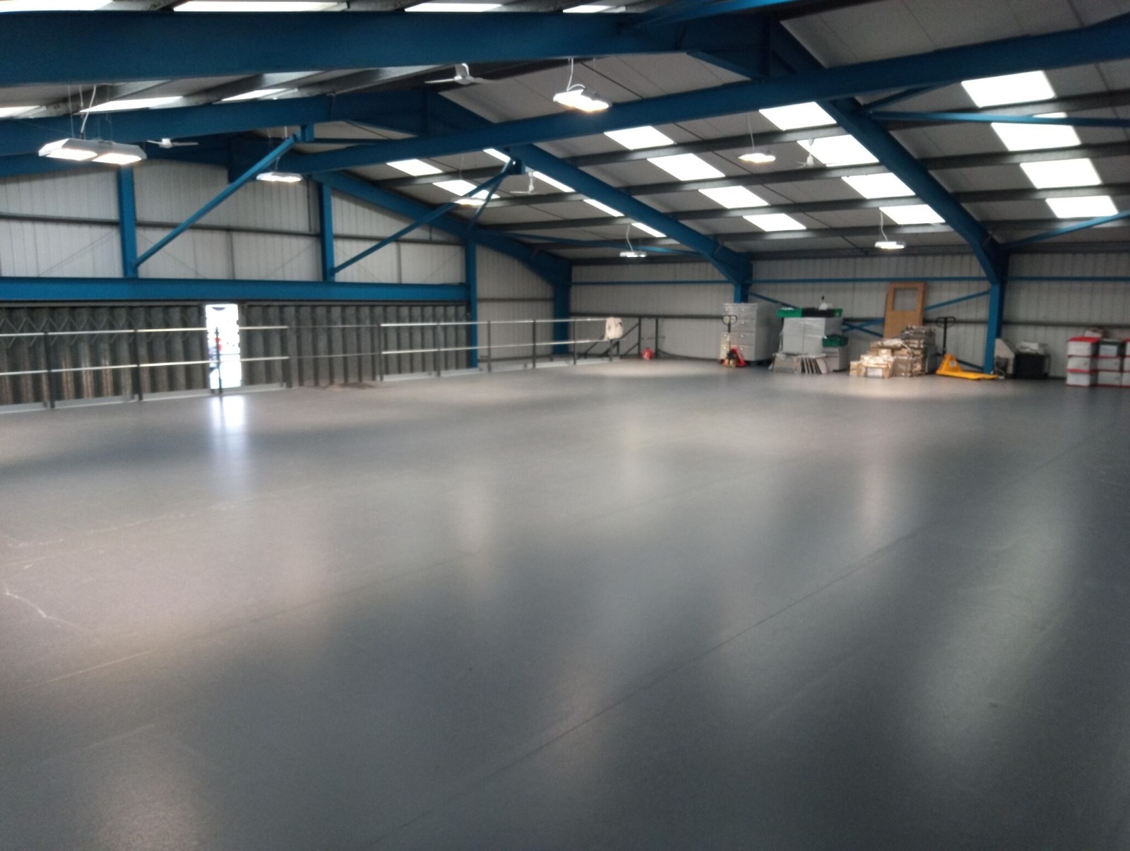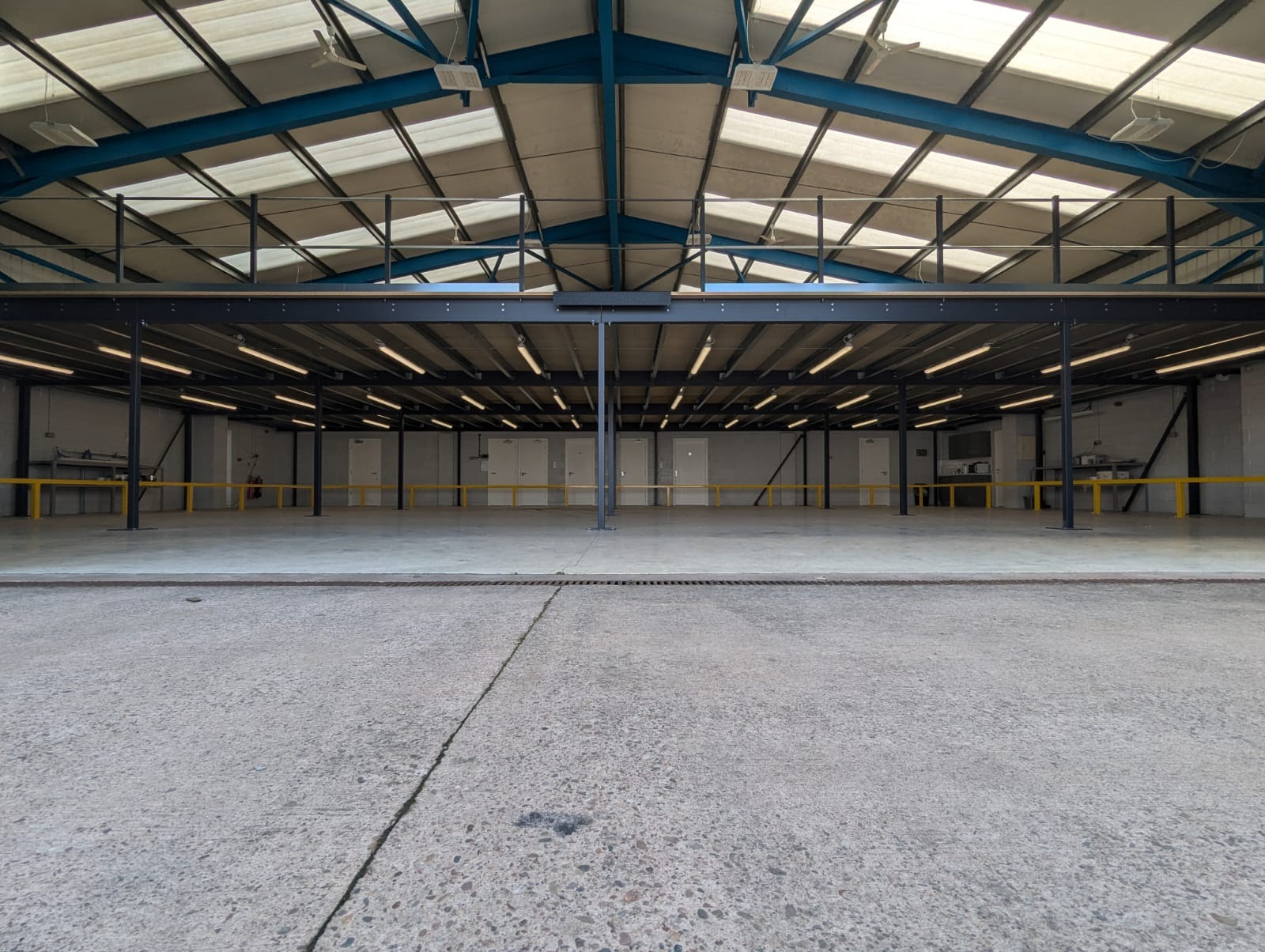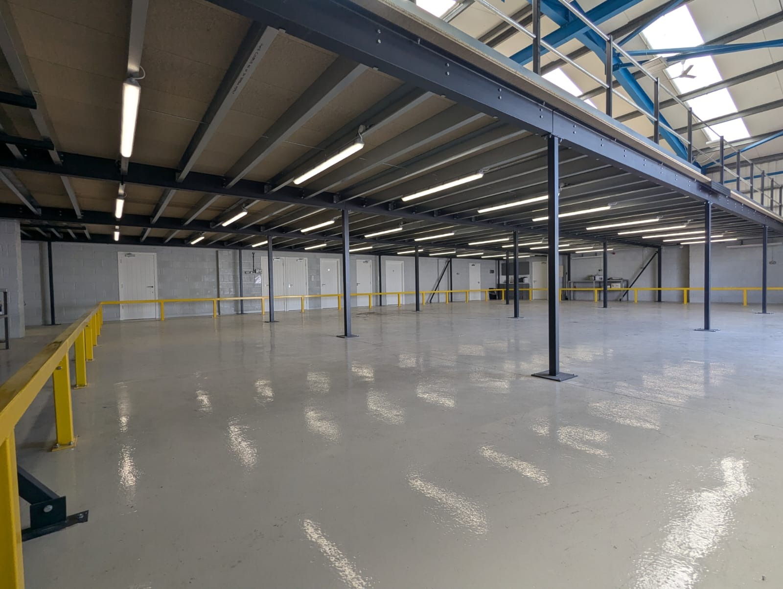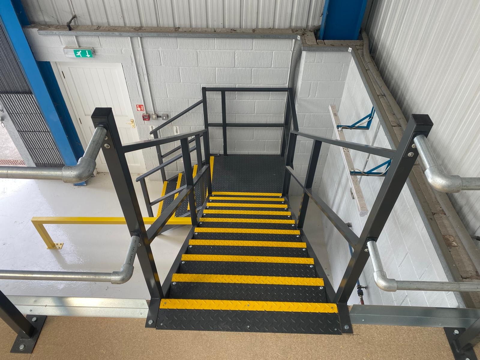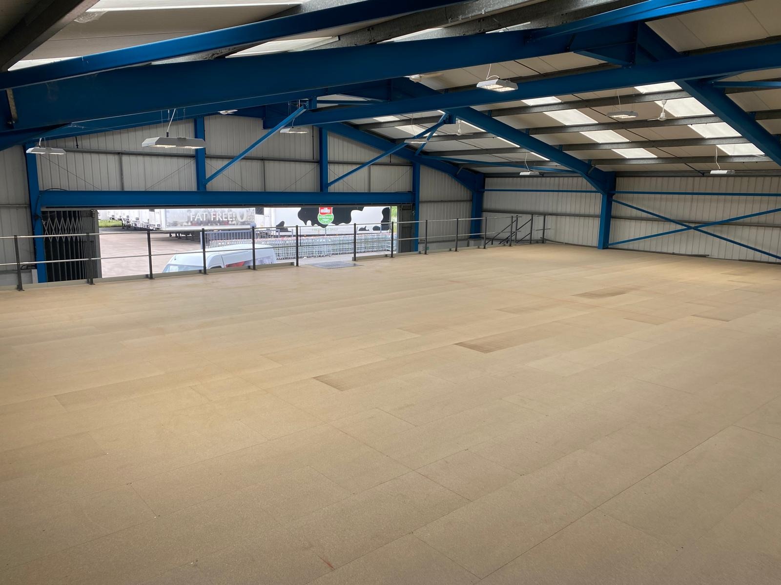 MMID Droitwich purchased a hanger near their site to store all their extra trolleys they need around Christmas time. They came to us for solutions to maximise the amount of trolleys they could get in this space. At first we fabricated and installed bespoke box section barriers, powder coated safety yellow, to the perimeter to form a walkway all around. Soon after they approached us for a mezzanine to double the floorspace they had in this facility. We installed a full mezzanine, with stress loads suited to the trolleys, with a staircase, sliding gate and handrail. We also laid safety polyflor for health a safety reasons when the trolleys have been in the rain, and also to stop water from damaging the chipboard. Finally, we installed a full lighting system on 4No individual PIR’s, using non- corrosive battens. This project has solved the trolley storage problem them originally had.